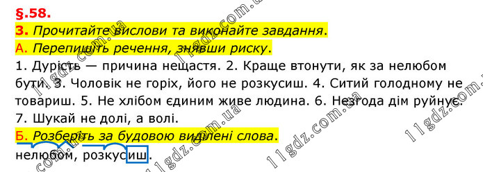 §.58. 3. Прочитайте вислови та виконайте завдання. А. Перепишіть речення, знявши риску. 1. Дурість — причина нещастя. 2. Краще втонути, як за нелюбом бути. 3. Чоловік не горіх, його не розкусиш. 4. Ситий голодному не товариш. 5. Не хлібом єдиним живе людина. 6. Незгода дім руйнує. 7. Шукай не долі, а волі. Б. Розберіть за будовою виділені слова. нелюбом, розкусиш.