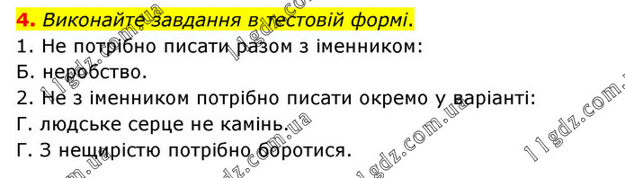 Виконайте завдання в тестовій формі. 1. Не потрібно писати разом з іменником: Б. неробство. 2. Не з іменником потрібно писати окремо у варіанті: Г. людське серце не камінь. Г. З нещирістю потрібно боротися.
