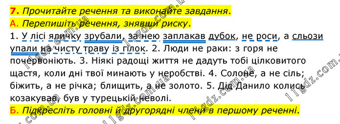 Прочитайте речення та виконайте завдання. А. Перепишіть речення, знявши риску. 1. У лісі яличку зрубали, за нею заплакав дубок, не роси, а сльози упали на чисту траву із гілок. 2. Люди не раки: з горя не почервоніють. 3. Ніякі радощі життя не дадуть тобі цілковитого щастя, коли дні твої минають у неробстві. 4. Солоне, а не сіль; біжить, а не річка; блищить, а не золото. 5. Дід Данило колись козакував, був у турецькій неволі. Б. Підкресліть головні й другорядні члени в першому реченні.