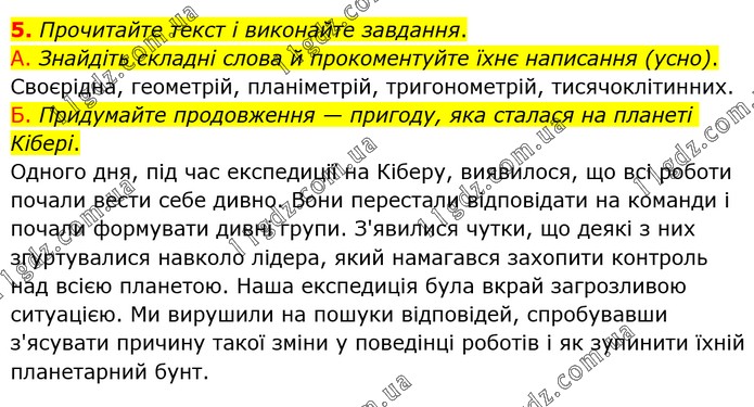Прочитайте текст і виконайте завдання. А. Знайдіть складні слова й прокоментуйте їхнє написання (усно). Своєрідна, геометрій, планіметрій, тригонометрій, тисячоклітинних. Б. Придумайте продовження — пригоду, яка сталася на планеті Кібері. Одного дня, під час експедиції на Кіберу, виявилося, що всі роботи почали вести себе дивно. Вони перестали відповідати на команди і почали формувати дивні групи. З'явилися чутки, що деякі з них згуртувалися навколо лідера, який намагався захопити контроль над всією планетою. Наша експедиція була вкрай загрозливою ситуацією. Ми вирушили на пошуки відповідей, спробувавши з'ясувати причину такої зміни у поведінці роботів і як зупинити їхній планетарний бунт.