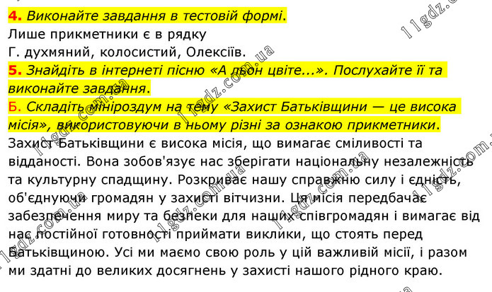 4. Виконайте завдання в тестовій формі. Лише прикметники є в рядку Г. духмяний, колосистий, Олексіїв. 5. Знайдіть в інтернеті пісню «А льон цвіте...». Послухайте її та виконайте завдання. Б. Складіть мініроздум на тему «Захист Батьківщини — це висока місія», використовуючи в ньому різні за ознакою прикметники. Захист Батьківщини є висока місія, що вимагає сміливості та відданості. Вона зобов'язує нас зберігати національну незалежність та культурну спадщину. Розкриває нашу справжню силу і єдність, об'єднуючи громадян у захисті вітчизни. Ця місія передбачає забезпечення миру та безпеки для наших співгромадян і вимагає від нас постійної готовності приймати виклики, що стоять перед Батьківщиною. Усі ми маємо свою роль у цій важливій місії, і разом ми здатні до великих досягнень у захисті нашого рідного краю.