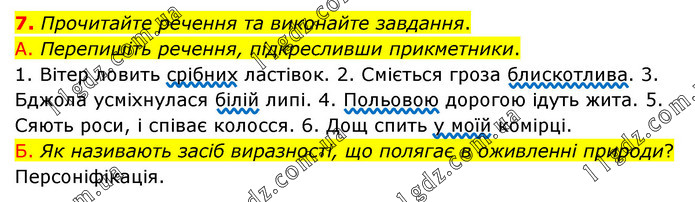 Прочитайте речення та виконайте завдання. А. Перепишіть речення, підкресливши прикметники. 1. Вітер ловить срібних ластівок. 2. Сміється гроза блискотлива. 3. Бджола усміхнулася білій липі. 4. Польовою дорогою ідуть жита. 5. Сяють роси, і співає колосся. 6. Дощ спить у моїй комірці. Б. Як називають засіб виразності, що полягає в оживленні природи? Персоніфікація.