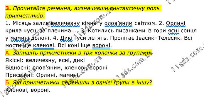 Прочитайте речення, визначивши синтаксичну роль прикметників. 1. Місяць залив величезну кімнату олов’яним світлом. 2. Орлині крила чуєш за плечима.... 3. Котились писанками із гори ясні сонця у мамині долоні. 4. Дикі гуси летять. Пролітає Івасик–Телесик. Всі мости ще кленові. Всі коні іще вороні. А. Запишіть прикметники в три колонки за групами. Якісні: величезну, ясні, дикі Відносні: олов’яним, кленові, вороні Присвійні: Орлині, мамині Б. Які прикметники перейшли з однієї групи в іншу? Кленові, вороні.