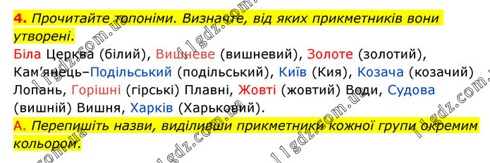 Прочитайте топоніми. Визначте, від яких прикметників вони утворені. Біла Церква (білий), Вишневе (вишневий), Золоте (золотий), Кам’янець–Подільський (подільський), Київ (Кия), Козача (козачий) Лопань, Горішні (гірські) Плавні, Жовті (жовтий) Води, Судова (вишній) Вишня, Харків (Харьковий). А. Перепишіть назви, виділивши прикметники кожної групи окремим кольором.