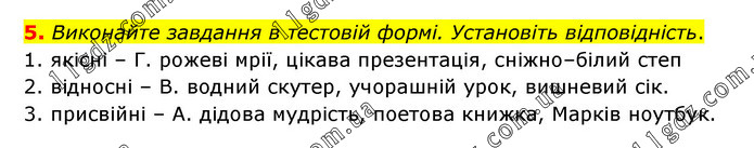 Виконайте завдання в тестовій формі. Установіть відповідність. 1. якісні – Г. рожеві мрії, цікава презентація, сніжно–білий степ 2. відносні – В. водний скутер, учорашній урок, вишневий сік. 3. присвійні – А. дідова мудрість, поетова книжка, Марків ноутбук.