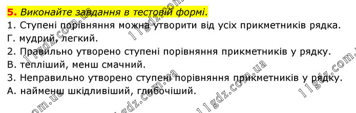 Виконайте завдання в тестовій формі. 1. Ступені порівняння можна утворити від усіх прикметників рядка. Г. мудрий, легкий. 2. Правильно утворено ступені порівняння прикметників у рядку. В. тепліший, менш смачний. 3. Неправильно утворено ступені порівняння прикметників у рядку. А. найменш шкідливіший, глибочіший.