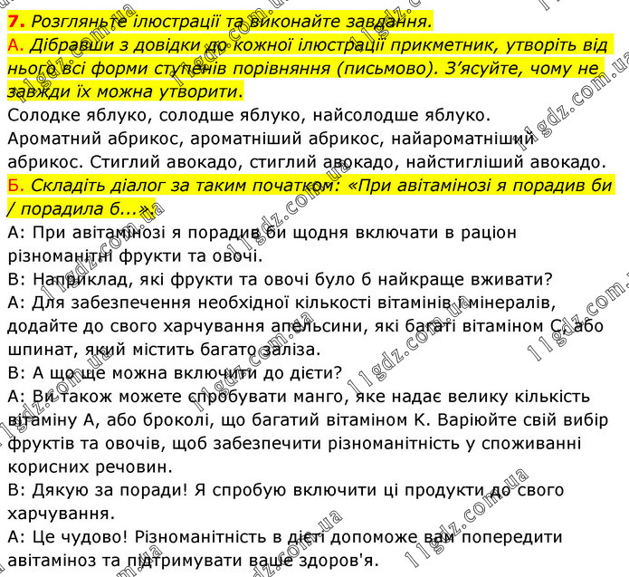 Розгляньте ілюстрації та виконайте завдання. А. Дібравши з довідки до кожної ілюстрації прикметник, утворіть від нього всі форми ступенів порівняння (письмово). З’ясуйте, чому не завжди їх можна утворити. Солодке яблуко, солодше яблуко, найсолодше яблуко. Ароматний абрикос, ароматніший абрикос, найароматніший абрикос. Стиглий авокадо, стиглий авокадо, найстигліший авокадо. Б. Складіть діалог за таким початком: «При авітамінозі я порадив би / порадила б...». А: При авітамінозі я порадив би щодня включати в раціон різноманітні фрукти та овочі. В: Наприклад, які фрукти та овочі було б найкраще вживати? А: Для забезпечення необхідної кількості вітамінів і мінералів, додайте до свого харчування апельсини, які багаті вітаміном C, або шпинат, який містить багато заліза. В: А що ще можна включити до дієти? А: Ви також можете спробувати манго, яке надає велику кількість вітаміну A, або броколі, що багатий вітаміном K. Варіюйте свій вибір фруктів та овочів, щоб забезпечити різноманітність у споживанні корисних речовин. В: Дякую за поради! Я спробую включити ці продукти до свого харчування. А: Це чудово! Різноманітність в дієті допоможе вам попередити авітаміноз та підтримувати ваше здоров'я.