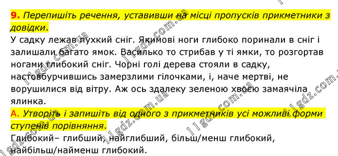 Перепишіть речення, уставивши на місці пропусків прикметники з довідки. У садку лежав пухкий сніг. Якимові ноги глибоко поринали в сніг і залишали багато ямок. Василько то стрибав у ті ямки, то розгортав ногами глибокий сніг. Чорні голі дерева стояли в садку, настовбурчившись замерзлими гілочками, і, наче мертві, не ворушилися від вітру. Аж ось здалеку зеленою хвоєю замаячіла ялинка. А. Утворіть і запишіть від одного з прикметників усі можливі форми ступенів порівняння. Глибокий– глибший, найглибший, більш/менш глибокий, найбільш/найменш глибокий.
