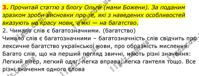 Прочитай статтю з блогу Ольги (мами Божени). За поданим зразком зроби висновки про те, які з наведених особливостей вказують на красу мови, а які — на багатство. 2. Чимало слів є багатозначними. (багатство) Чимало слів є багатозначними – багатозначність слів свідчить про лексичне багатство української мови, про образність мислення. Багато слів, що на перший погляд звичні, мають різні значення: Легкий вітер, легкий одяг, легка вправа, легка гантеля тощо. Все різні значення одного слова
