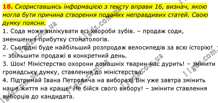 Скориставшись інформацією з тексту вправи 16, визнач, якою могла бути причина створення поданих неправдивих статей. Свою думку поясни. 1. Сода може вилікувати всі хвороби зубів. – продаж соди, зменшення прибутку стоматологів. 2. Сьогодні буде найбільший розпродаж велосипедів за всю історію! – збільшити продажі в конкретний день. 3. Шок! Міністерство охорони домашніх тварин нас дурить! – змінити громадську думку, ставлення до міністерства. 4. Підтримай Івана Петровича на виборах! Він уже завтра змінить наше життя на краще! Не бійся свого вибору! – змінити ставлення виборців до кандидата.