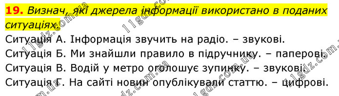 Визнач, які джерела інформації використано в поданих ситуаціях. Ситуація А. Інформація звучить на радіо. – звукові. Ситуація Б. Ми знайшли правило в підручнику. – паперові. Ситуація В. Водій у метро оголошує зупинку. – звукові. Ситуація Г. На сайті новин опублікували статтю. – цифрові.