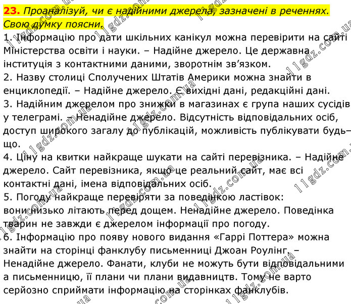 Проаналізуй, чи є надійними джерела, зазначені в реченнях. Свою думку поясни. 1. Інформацію про дати шкільних канікул можна перевірити на сайті Міністерства освіти і науки. – Надійне джерело. Це державна інституція з контактними даними, зворотнім зв’язком. 2. Назву столиці Сполучених Штатів Америки можна знайти в енциклопедії. – Надійне джерело. Є вихідні дані, редакційні дані. 3. Надійним джерелом про знижки в магазинах є група наших сусідів у телеграмі. – Ненадійне джерело. Відсутність відповідальних осіб, доступ широкого загалу до публікацій, можливість публікувати будь–що. 4. Ціну на квитки найкраще шукати на сайті перевізника. – Надійне джерело. Сайт перевізника, якщо це реальний сайт, має всі контактні дані, імена відповідальних осіб. 5. Погоду найкраще перевіряти за поведінкою ластівок: вони низько літають перед дощем. Ненадійне джерело. Поведінка тварин не завжди є джерелом інформації про погоду. 6. Інформацію про появу нового видання «Гаррі Поттера» можна знайти на сторінці фанклубу письменниці Джоан Роулінг. – Ненадійне джерело. Фанати, клуби не можуть бути відповідальними а письменницю, її плани чи плани видавництв. Тому не варто серйозно сприймати інформацію на сторінках фанклубів.