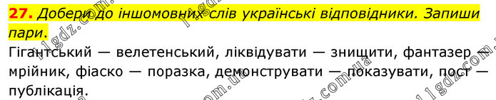 Добери до іншомовних слів українські відповідники. Запиши пари. Гігантський — велетенський, ліквідувати — знищити, фантазер — мрійник, фіаско — поразка, демонструвати — показувати, пост — публікація.