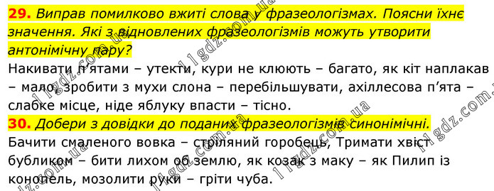 29. Виправ помилково вжиті слова у фразеологізмах. Поясни їхнє значення. Які з відновлених фразеологізмів можуть утворити антонімічну пару? Накивати п’ятами – утекти, кури не клюють – багато, як кіт наплакав – мало, зробити з мухи слона – перебільшувати, ахіллесова п’ята – слабке місце, ніде яблуку впасти – тісно. 30. Добери з довідки до поданих фразеологізмів синонімічні. Бачити смаленого вовка – стріляний горобець, Тримати хвіст бубликом – бити лихом об землю, як козак з маку – як Пилип із конопель, мозолити руки – гріти чуба.