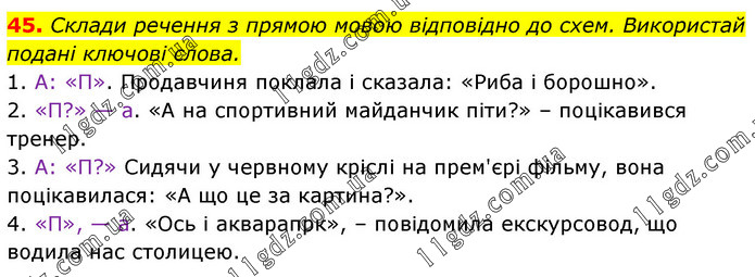 Склади речення з прямою мовою відповідно до схем. Використай подані ключові слова. 1. А: «П». Продавчиня поклала і сказала: «Риба і борошно». 2. «П?» — а. «А на спортивний майданчик піти?» – поцікавився тренер. 3. А: «П?» Сидячи у червному кріслі на прем'єрі фільму, вона поцікавилася: «А що це за картина?». 4. «П», — а. «Ось і акварапрк», – повідомила екскурсовод, що водила нас столицею.