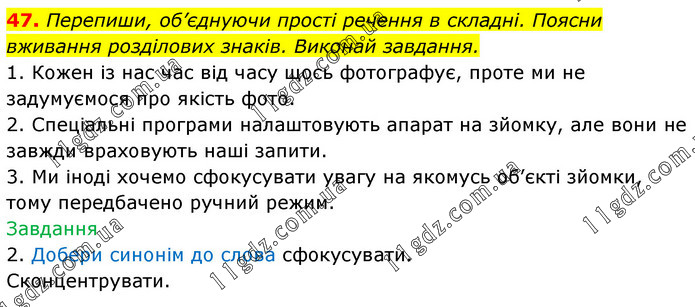 Перепиши, об’єднуючи прості речення в складні. Поясни вживання розділових знаків. Виконай завдання. 1. Кожен із нас час від часу щось фотографує, проте ми не задумуємося про якість фото. 2. Спеціальні програми налаштовують апарат на зйомку, але вони не завжди враховують наші запити. 3. Ми іноді хочемо сфокусувати увагу на якомусь об’єкті зйомки, тому передбачено ручний режим. Завдання 2. Добери синонім до слова сфокусувати. Сконцентрувати.