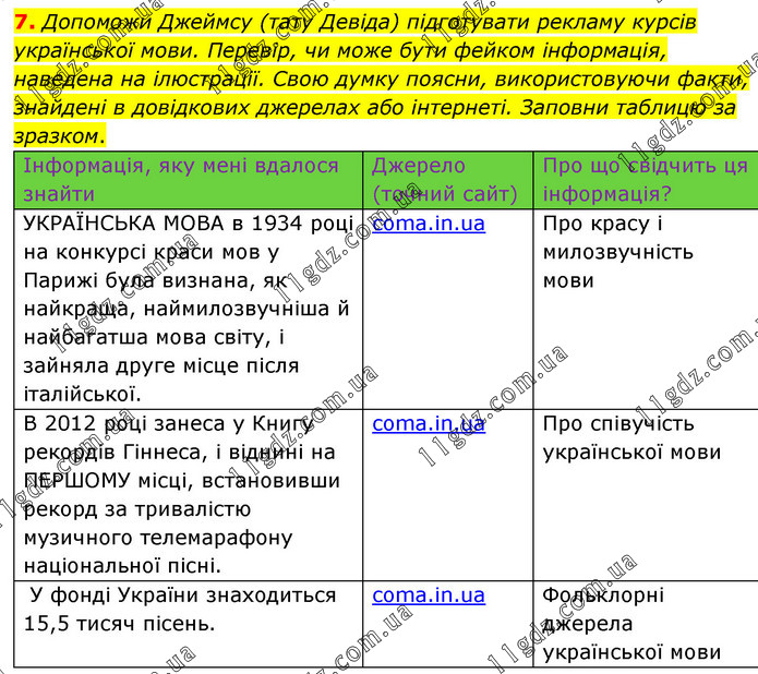 Допоможи Джеймсу (тату Девіда) підготувати рекламу курсів української мови. Перевір, чи може бути фейком інформація, наведена на ілюстрації. Свою думку поясни, використовуючи факти, знайдені в довідкових джерелах або інтернеті. Заповни таблицю за зразком.