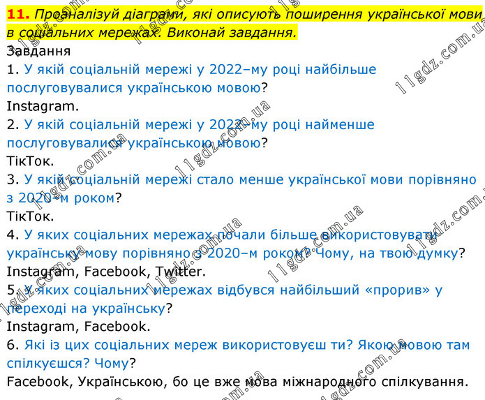 Проаналізуй діаграми, які описують поширення української мови в соціальних мережах. Виконай завдання. Завдання 1. У якій соціальній мережі у 2022–му році найбільше послуговувалися українською мовою? Instagram. 2. У якій соціальній мережі у 2022–му році найменше послуговувалися українською мовою? ТікТок. 3. У якій соціальній мережі стало менше української мови порівняно з 2020–м роком? ТікТок. 4. У яких соціальних мережах почали більше використовувати українську мову порівняно з 2020–м роком? Чому, на твою думку? Instagram, Facebook, Twitter. 5. У яких соціальних мережах відбувся найбільший «прорив» у переході на українську? Instagram, Facebook. 6. Які із цих соціальних мереж використовуєш ти? Якою мовою там спілкуєшся? Чому? Facebook, Українською, бо це вже мова міжнародного спілкування.