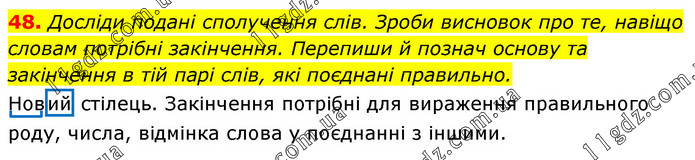 Досліди подані сполучення слів. Зроби висновок про те, навіщо словам потрібні закінчення. Перепиши й познач основу та закінчення в тій парі слів, які поєднані правильно. Новий стілець. Закінчення потрібні для вираження правильного роду, числа, відмінка слова у поєднанні з іншими.