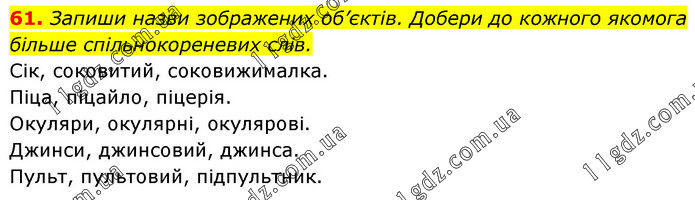 Запиши назви зображених об’єктів. Добери до кожного якомога більше спільнокореневих слів. Сік, соковитий, соковижималка. Піца, піцайло, піцерія. Окуляри, окулярні, окулярові. Джинси, джинсовий, джинса. Пульт, пультовий, підпультник.