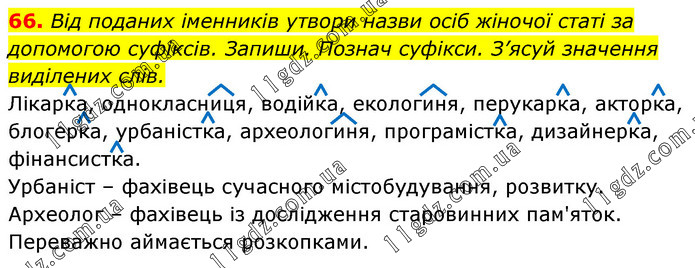 Від поданих іменників утвори назви осіб жіночої статі за допомогою суфіксів. Запиши. Познач суфікси. З’ясуй значення виділених слів. Лікарка, однокласниця, водійка, екологиня, перукарка, акторка, блогерка, урбаністка, археологиня, програмістка, дизайнерка, фінансистка. Урбаніст – фахівець сучасного містобудування, розвитку. Археолог – фахівець із дослідження старовинних пам'яток. Переважно аймається розкопками.
