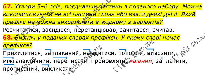 67. Утвори 5–6 слів, поєднавши частини з поданого набору. Можна використовувати не всі частини слова або взяти деякі двічі. Який префікс не можна використати в жодному з варіантів? Розчитатися, засидівся, перетанцював, зачитався, зчитав. 68. Визнач у поданих словах префікси. У якому слові немає префікса? Прихилитися, заплаканий, наїздитися, попоїсти, вивозити, міжгалактичний, переписати, промовляти, наївний, заплатити, прописаний, викликати.