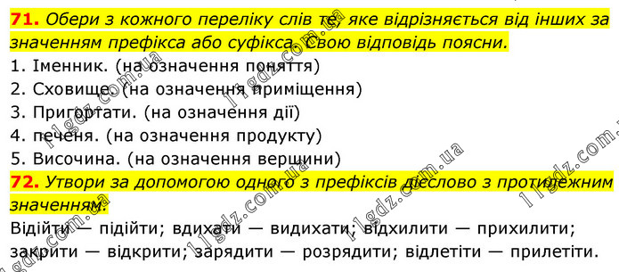 71. Обери з кожного переліку слів те, яке відрізняється від інших за значенням префікса або суфікса. Свою відповідь поясни. 1. Іменник. (на означення поняття) 2. Сховище. (на означення приміщення) 3. Пригортати. (на означення дії) 4. печеня. (на означення продукту) 5. Височина. (на означення вершини) 72. Утвори за допомогою одного з префіксів дієслово з протилежним значенням. Відійти — підійти; вдихати — видихати; відхилити — прихилити; закрити — відкрити; зарядити — розрядити; відлетіти — прилетіти.