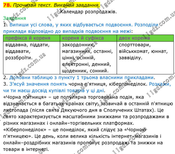 Прочитай текст. Виконай завдання. Календар розпродажів. Завдання 1. Випиши усі слова, у яких відбувається подвоєння. Розподіли приклади відповідно до випадків подвоєння на межі: префікса й кореня кореня й суфікса двох коренів віддавна, піддати, віддавати, роззброїти. закордонних, магазинних, останні, цінні, осінній, електронні, денний, щоденник, сонний. спорттовари, військкомат, юннат, заввіділу. 2. Доповни таблицю з пункту 1 трьома власними прикладами. 3. З’ясуй значення понять чорна п'ятниця, кіберпонеділок. Розкажи, чи ти маєш досвід купівлі товарів у ці дні. «Чорна п'ятниця» – це популярна торговельна подія, яка відзначається в багатьох країнах світу, зазвичай в останній п'ятницю листопада (після свята Дякуючого дня в Сполучених Штатах). Це свято характеризується масштабними знижками та розпродажами в різних магазинах і онлайн–торгівельних платформах. «Кіберпонеділок» – це понеділок, який слідує за «Чорною п'ятницею». Це день, коли велика кількість інтернет–магазинів і онлайн–роздрібних магазинів пропонує розпродажі та знижки на товари в інтернеті.