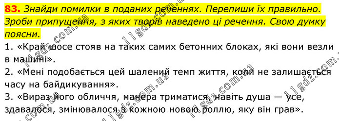 Знайди помилки в поданих реченнях. Перепиши їх правильно. Зроби припущення, з яких творів наведено ці речення. Свою думку поясни. 1. «Край шосе стояв на таких самих бетонних блоках, які вони везли в машині». 2. «Мені подобається цей шалений темп життя, коли не залишається часу на байдикування». 3. «Вираз його обличчя, манера триматися, навіть душа — усе, здавалося, змінювалося з кожною новою роллю, яку він грав».