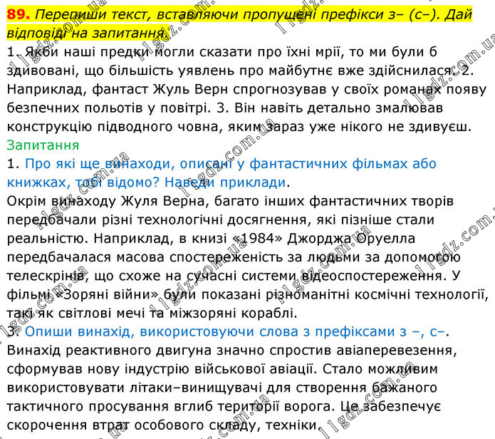 Перепиши текст, вставляючи пропущені префікси з– (с–). Дай відповіді на запитання. 1. Якби наші предки могли сказати про їхні мрії, то ми були б здивовані, що більшість уявлень про майбутнє вже здійснилася. 2. Наприклад, фантаст Жуль Верн спрогнозував у своїх романах появу безпечних польотів у повітрі. 3. Він навіть детально змалював конструкцію підводного човна, яким зараз уже нікого не здивуєш. Запитання 1. Про які ще винаходи, описані у фантастичних фільмах або книжках, тобі відомо? Наведи приклади. Окрім винаходу Жуля Верна, багато інших фантастичних творів передбачали різні технологічні досягнення, які пізніше стали реальністю. Наприклад, в книзі «1984» Джорджа Оруелла передбачалася масова спостереженість за людьми за допомогою телескрінів, що схоже на сучасні системи відеоспостереження. У фільмі «Зоряні війни» були показані різноманітні космічні технології, такі як світлові мечі та міжзоряні кораблі. 3. Опиши винахід, використовуючи слова з префіксами з –, с–. Винахід реактивного двигуна значно спростив авіаперевезення, сформував нову індустрію військової авіації. Стало можливим використовувати літаки–винищувачі для створення бажаного тактичного просування вглиб території ворога. Це забезпечує скорочення втрат особового складу, техніки.