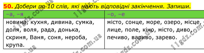 Добери по 10 слів, які мають відповідні закінчення. Запиши. –а, –я –о, –е новина, кухня, дивина, сумка, доля, воля, рада, донька, скриня, Ваня, соня, нероба, крупа. місто, сонце, море, озеро, місце, лице, поле, кіно, місто, диво, печиво, вариво, зарево.