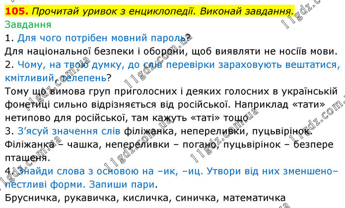 Прочитай уривок з енциклопедії. Виконай завдання. Завдання 1. Для чого потрібен мовний пароль? Для національної безпеки і оборони, щоб виявляти не носіїв мови. 2. Чому, на твою думку, до слів перевірки зараховують вештатися, кмітливий, телепень? Тому що вимова груп приголосних і деяких голосних в українській фонетиці сильно відрізняється від російської. Наприклад «тати» нетипово для російської, там кажуть «таті» тощо 3. З’ясуй значення слів філіжанка, непереливки, пуцьвірінок. Філіжанка – чашка, непереливки – погано, пуцьвірінок – безпере пташеня. 4. Знайди слова з основою на –ик, –иц. Утвори від них зменшено– пестливі форми. Запиши пари. Брусничка, рукавичка, кисличка, синичка, математичка