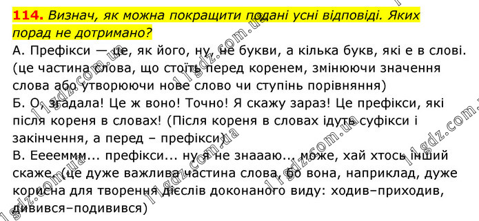 Визнач, як можна покращити подані усні відповіді. Яких порад не дотримано? А. Префікси — це, як його, ну, не букви, а кілька букв, які е в слові. (це частина слова, що стоїть перед коренем, змінюючи значення слова або утворюючи нове слово чи ступінь порівняння) Б. О, згадала! Це ж воно! Точно! Я скажу зараз! Це префікси, які після кореня в словах! (Після кореня в словах ідуть суфікси і закінчення, а перед – префікси) В. Ееееммм... префікси... ну я не знаааю... може, хай хтось інший скаже. (це дуже важлива частина слова, бо вона, наприклад, дуже корисна для творення дієслів доконаного виду: ходив–приходив, дивився–подивився)