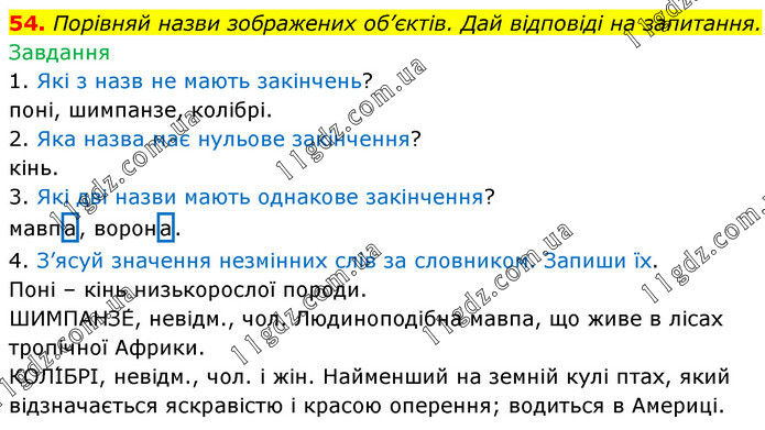 Порівняй назви зображених об’єктів. Дай відповіді на запитання. Завдання 1. Які з назв не мають закінчень? поні, шимпанзе, колібрі. 2. Яка назва має нульове закінчення? кінь. 3. Які дві назви мають однакове закінчення? мавпа, ворона. 4. З’ясуй значення незмінних слів за словником. Запиши їх. Поні – кінь низькорослої породи. ШИМПАНЗЕ́, невідм., чол. Людиноподібна мавпа, що живе в лісах тропічної Африки. КОЛІ́БРІ, невідм., чол. і жін. Найменший на земній кулі птах, який відзначається яскравістю і красою оперення; водиться в Америці.