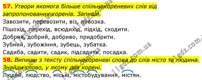 57. Утвори якомога більше спільнокореневих слів від запропонованих коренів. Запиши. Завозити, перевозити, віз, повозка. Пішохід, перехід, всюдихід, підхід, сходити. Добряк, добрий, добриво, придобрити. Зубний, зубожіння, зубець, зубатка. Садиба, садити, садик, підсадити, посадка. 58. Випиши з тексту спільнокореневі слова до слів місто та людина. Знайди слово, у якому два корені. Людей, людство, міські, містобудування, містян.