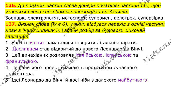 136. До поданих частин слова добери початкові частини так, щоб утворити слово способом основоскладання. Запиши. Зоопарк, електропотяг, мотоспорт, супермен, велотрек, суперзірка. 137. Визнач слова (їх є 6), у яких відбувся перехід з однієї частини мови в іншу. Випиши їх і зроби розбір за будовою. Виконай завдання. 1. Багато вчених намагалися створити літальні апарати. 2. Щасливцем став відкритий до нового Леонардо да Вінчі. 3. Цей винахідник розмовляв італійською, іспанською та французькою. 4. Перший його проект вважають прототипом сучасного гелікоптера. 5. Ідеї Леонардо да Вінчі й досі ніби з далекого майбутнього.