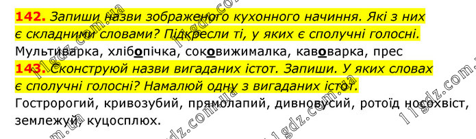 142. Запиши назви зображеного кухонного начиння. Які з них є складними словами? Підкресли ті, у яких є сполучні голосні. Мультиварка, хлібопічка, соковижималка, кавоварка, прес 143. Сконструюй назви вигаданих істот. Запиши. У яких словах є сполучні голосні? Намалюй одну з вигаданих істот. Гостророгий, кривозубий, прямолапий, дивновусий, ротоїд носохвіст, землежуй, куцосплюх.