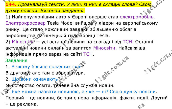 144. Проаналізуй тексти. У яких із них є складні слова? Свою думку поясни. Виконай завдання. 1) Найпопулярнішим авто у Європі вперше став електромобіль. Електрокросовер Тesla Model вийшов у лідери на європейському ринку. Це стало можливим завдяки збільшенню обсягів виробництва на німецькій гігафабриці Теsla. 2) Міносвіти — усі останні новини на сьогодні від ТСН. Останні актуальні новини онлайн за запитом Міносвіти. Найсвіжіша інформація прямо зараз на сайті ТСН. Завдання 1. В якому більше складних слів? В другому, але там є абревіатури. 2. Що вони означають? Міністерство освіти, телевізійна служба новин. 3. Яке можна назвати новиною, а яке — ні? Свою думку поясни. Перший – це новини, бо там є нова інформація, факти. події. Другий – це реклама.
