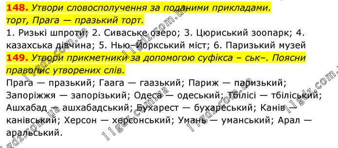 148. Утвори словосполучення за поданими прикладами. торт, Прага — празький торт. 1. Ризькі шпроти; 2. Сиваське озеро; 3. Цюриський зоопарк; 4. казахська дівчина; 5. Нью–Йоркський міст; 6. Паризький музей 149. Утвори прикметники за допомогою суфікса – ськ–. Поясни правопис утворених слів. Прага — празький; Гаага — гаазький; Париж — паризький; Запоріжжя — запорізький; Одеса — одеський; Тбілісі — тбіліський; Ашхабад — ашхабадський; Бухарест — бухареський; Канів — канівський; Херсон — херсонський; Умань — уманський; Арал — аральський.