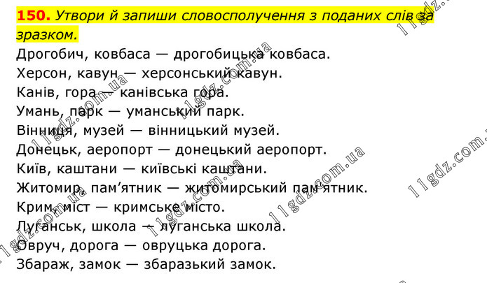 Утвори й запиши словосполучення з поданих слів за зразком. Дрогобич, ковбаса — дрогобицька ковбаса. Херсон, кавун — херсонський кавун. Канів, гора — канівська гора. Умань, парк — уманський парк. Вінниця, музей — вінницький музей. Донецьк, аеропорт — донецький аеропорт. Київ, каштани — київські каштани. Житомир, пам’ятник — житомирський пам'ятник. Крим, міст — кримське місто. Луганськ, школа — луганська школа. Овруч, дорога — овруцька дорога. Збараж, замок — збаразький замок.