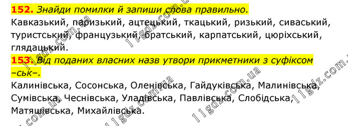 152. Знайди помилки й запиши слова правильно. Кавказький, паризький, ацтецький, ткацький, ризький, сиваський, туристський, французький, братський, карпатський, цюріхський, глядацький. 153. Від поданих власних назв утвори прикметники з суфіксом –ськ–. Калинівська, Сосонська, Оленівська, Гайдуківська, Малинівська, Сумівська, Чеснівська, Уладівська, Павлівська, Слобідська, Матяшівська, Михайлівська.