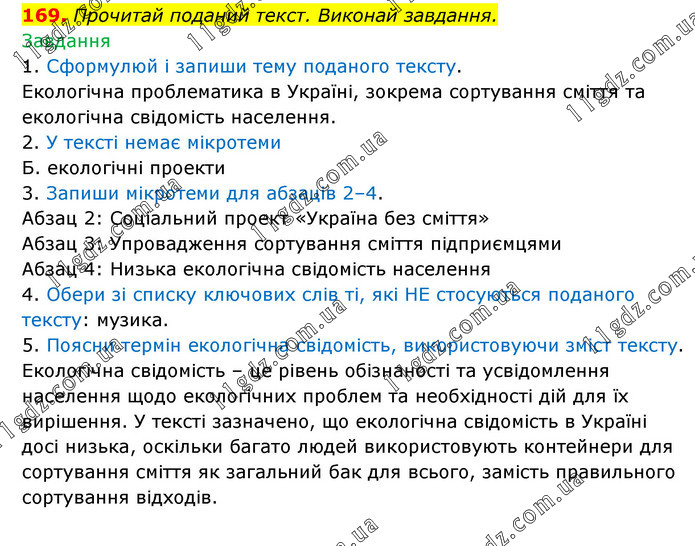 Прочитай поданий текст. Виконай завдання. Завдання 1. Сформулюй і запиши тему поданого тексту. Екологічна проблематика в Україні, зокрема сортування сміття та екологічна свідомість населення. 2. У тексті немає мікротеми Б. екологічні проекти 3. Запиши мікротеми для абзаців 2–4. Абзац 2: Соціальний проект «Україна без сміття» Абзац 3: Упровадження сортування сміття підприємцями Абзац 4: Низька екологічна свідомість населення 4. Обери зі списку ключових слів ті, які НЕ стосуються поданого тексту: музика. 5. Поясни термін екологічна свідомість, використовуючи зміст тексту. Екологічна свідомість – це рівень обізнаності та усвідомлення населення щодо екологічних проблем та необхідності дій для їх вирішення. У тексті зазначено, що екологічна свідомість в Україні досі низька, оскільки багато людей використовують контейнери для сортування сміття як загальний бак для всього, замість правильного сортування відходів.