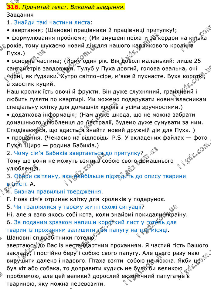 Прочитай текст. Виконай завдання. Завдання 1. Знайди такі частини листа: • звертання; (Шановні працівники й працівниці притулку!; • формулювання проблеми; (Ми змушені поїхати за кордон на кілька років, тому шукаємо новий дім для нашого карликового кролика Пуха.) • основна частина; (Йому один рік. Він доволі маленький: лише 25 сантиметрів завдовжки. Тулуб у Пуха довгий, голова овальна, очі чорні, як ґудзики. Хутро світло–сіре, м’яке й пухнасте. Вуха короткі, а хвостик куций. Наш кролик їсть овочі й фрукти. Він дуже слухняний, грайливий і любить гуляти по квартирі. Ми можемо подарувати новим власникам спеціальну клітку для домашніх кролів з усіма зручностями.) • додаткова інформація; (Нам дуже шкода, що не можна забрати домашнього улюбленця до Австралії, будемо дуже сумувати за ним. Сподіваємося, що вдасться знайти новий дружній дім для Пуха. ) • прощання. (Чекаємо на відповідь! Р.S. У вкладених файлах — фото Пуха. Щиро — родина Бабиків.) 2. Чому сім’я Бабиків звертається до притулку? Тому що вони не можуть взяти з собою свого домашнього улюбленця. 3. Обери світлину, яка найбільше підходить до опису тварини в листі. А. 4. Визнач правильні твердження. Г. Нова сім’я отримає клітку для кроликів у подарунок. 5. Чи траплялися у твоєму житті схожі ситуації? Ні, але я взяв якось собі кота, коли знайомі покидали Україну. 6. За поданим зразком напиши короткий лист у готель для тварин із проханням залишити там папугу на три місяці. Шановні співробітники готелю, звертаюсь до Вас із нестандартним проханням. Я частий гість Вашого закладу, і постійно беру і собою свого папугу. Але цього разу маю вирушити далеко і надовго. Птаха взяти собою не можна. Якби це був кіт або собака, то доправити кудись не було би великою проблемою, але цей великий дорослий екзотичний папуга не є твариною, яку можна перевозити.