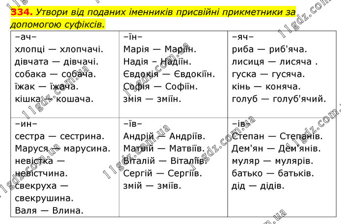 Утвори від поданих іменників присвійні прикметники за допомогою суфіксів. –ач– хлопці — хлопчачі. дівчата — дівчачі. собака — собача. їжак — їжача. кішка — кошача. –їн– Марія — Маріїн. Надія – Надіїн. Євдокія — Євдокіїн. Софія — Софіїн. змія — зміїн. –яч– риба — риб'яча. лисиця — лисяча . гуска — гусяча. кінь — коняча. голуб — голуб'ячий. –ин– сестра — сестрина. Маруся — марусина. невістка — невістчина. свекруха — свекрушина. Валя — Влина. –їв– Андрій — Андріїв. Матвій — Матвіїв. Віталій — Віталіїв. Сергій — Сергіїв. змій — зміїв. –ів– Степан — Степанів. Дем'ян — Дем'янів. муляр — мулярів. батько — батьків. дід — дідів.