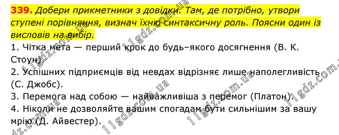 Добери прикметники з довідки. Там, де потрібно, утвори ступені порівняння, визнач їхню синтаксичну роль. Поясни один із висловів на вибір. 1. Чітка мета — перший крок до будь–якого досягнення (В. К. Стоун). 2. Успішних підприємців від невдах відрізняє лише наполегливість (С. Джобс). 3. Перемога над собою — найважливіша з перемог (Платон). 4. Ніколи не дозволяйте вашим спогадам бути сильнішим за вашу мрію (Д. Айвестер).