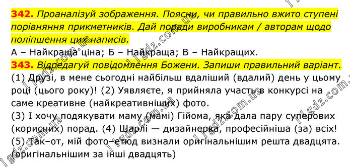 342. Проаналізуй зображення. Поясни, чи правильно вжито ступені порівняння прикметників. Дай поради виробникам / авторам щодо поліпшення цих написів. А – Найкраща ціна; Б – Найкраща; В – Найкращих. 343. Відредагуй повідомлення Божени. Запиши правильний варіант. (1) Друзі, в мене сьогодні найбільш вдаліший (вдалий) день у цьому році (цього року)! (2) Уявляєте, я прийняла участь в конкурсі на саме креативне (найкреативніших) фото. (3) І хочу подякувати маму (мамі) Гійома, яка дала пару суперових (корисних) порад. (4) Шарлі — дизайнерка, професійніша (за) всіх! (5) Так–от, мій фото–етюд визнали оригінальнішим решта двадцята. (оригінальнішим за інші двадцять)