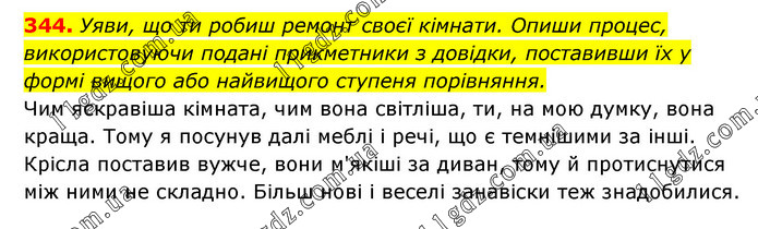 Уяви, що ти робиш ремонт своєї кімнати. Опиши процес, використовуючи подані прикметники з довідки, поставивши їх у формі вищого або найвищого ступеня порівняння. Чим яскравіша кімната, чим вона світліша, ти, на мою думку, вона краща. Тому я посунув далі меблі і речі, що є темнішими за інші. Крісла поставив вужче, вони м'якіші за диван, тому й протиснутися між ними не складно. Більш нові і веселі занавіски теж знадобилися.