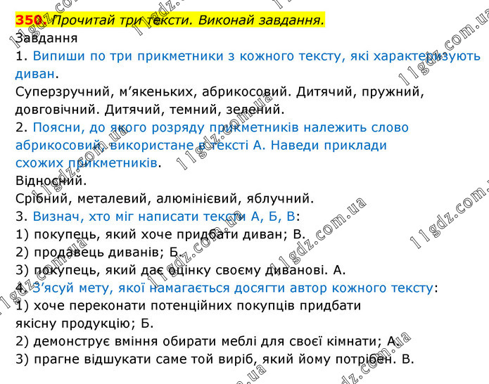 Прочитай три тексти. Виконай завдання. Завдання 1. Випиши по три прикметники з кожного тексту, які характеризують диван. Суперзручний, м’якеньких, абрикосовий. Дитячий, пружний, довговічний. Дитячий, темний, зелений. 2. Поясни, до якого розряду прикметників належить слово абрикосовий, використане в тексті А. Наведи приклади схожих прикметників. Відносний. Срібний, металевий, алюмінієвий, яблучний. 3. Визнач, хто міг написати тексти А, Б, В: 1) покупець, який хоче придбати диван; В. 2) продавець диванів; Б. 3) покупець, який дає оцінку своєму диванові. А. 4. З’ясуй мету, якої намагається досягти автор кожного тексту: 1) хоче переконати потенційних покупців придбати якісну продукцію; Б. 2) демонструє вміння обирати меблі для своєї кімнати; А. 3) прагне відшукати саме той виріб, який йому потрібен. В.