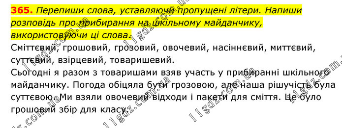 Перепиши слова, уставляючи пропущені літери. Напиши розповідь про прибирання на шкільному майданчику, використовуючи ці слова. Сміттєвий, грошовий, грозовий, овочевий, насіннєвий, миттєвий, суттєвий, взірцевий, товаришевий. Сьогодні я разом з товаришами взяв участь у прибиранні шкільного майданчику. Погода обіцяла бути грозовою, але наша рішучість була суттєвою. Ми взяли овочевий відходи і пакети для сміття. Це було грошовий збір для класу.