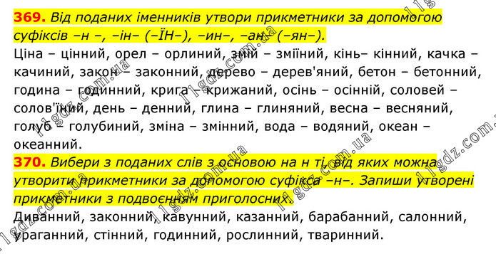 369. Від поданих іменників утвори прикметники за допомогою суфіксів –н –, –ін– (–ЇН–), –ин–, –ан– (–ян–). Ціна – цінний, орел – орлиний, змій – зміїний, кінь– кінний, качка – качиний, закон – законний, дерево – дерев'яний, бетон – бетонний, година – годинний, крига – крижаний, осінь – осінній, соловей – солов'їний, день – денний, глина – глиняний, весна – весняний, голуб – голубиний, зміна – змінний, вода – водяний, океан – океанний. 370. Вибери з поданих слів з основою на н ті, від яких можна утворити прикметники за допомогою суфікса –н–. Запиши утворені прикметники з подвоєнням приголосних. Диванний, законний, кавунний, казанний, барабанний, салонний, ураганний, стінний, годинний, рослинний, тваринний.